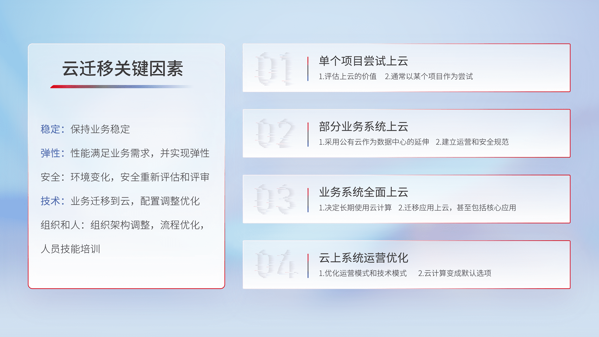 结合实际业务,,,,从规划设计、、、、云平台选型、、、云原生改造、、、数据迁移、、、集成交付,,,迁移全过程为客户识别最佳上云路径,,,做好风险识别管理,,,设计网络架构、、、、身份权限、、、安全审计合规、、、、操作审计、、、日志审计、、、监控告警策略、、、多站点容灾设计等,,对云上基础设施进行整体规划,,,,提升IT治理水平,,,,以满足弹性、、、、高可用、、高性能的需求。。。