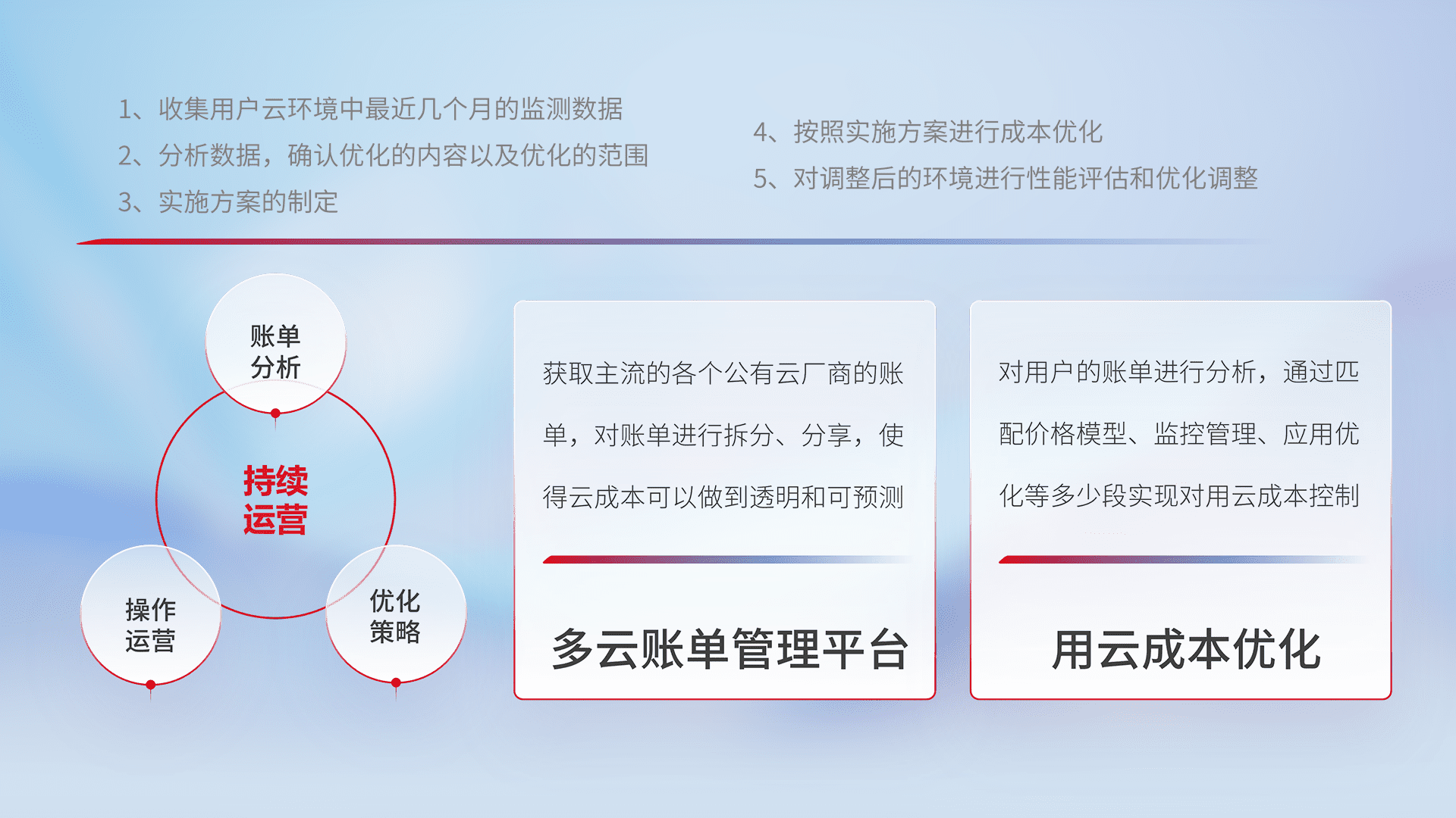 通过多云纳管,,,,以统一的资源数据模型把客户的云资源进行抽象和封装,,进而实现对多云资源的统一操作,,保障云资源管理的可靠性、、、、稳定性与可用性。。。量身定制化运维内容,,,配置、、开发运维、、补丁管理、、、、备份、、、监控、、认证和访问管理、、、、审计和日常巡检等,,保障在用云过程中的可靠度,,稳定度以及高可用率。。